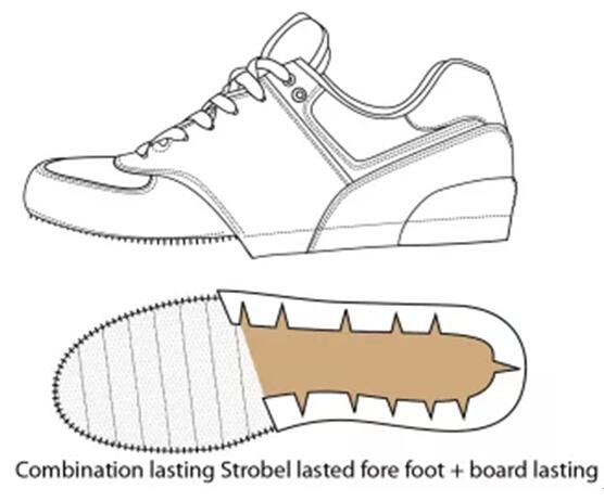 Combining the best of two worlds gives a combination lasting. Normally you want to ensure a flexible toe area you achieve with strobel construction and the stability of waist and heel with board lasting.