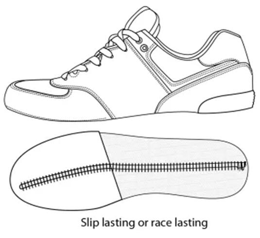 This lasting method belongs to the category of Slip lasting or Force lasting. As the category name indicates the shoe last is “slipped” or “forced” into the upper. The upper is normally heated to be more flexible. The Strobel lasting method is also known as California construction.